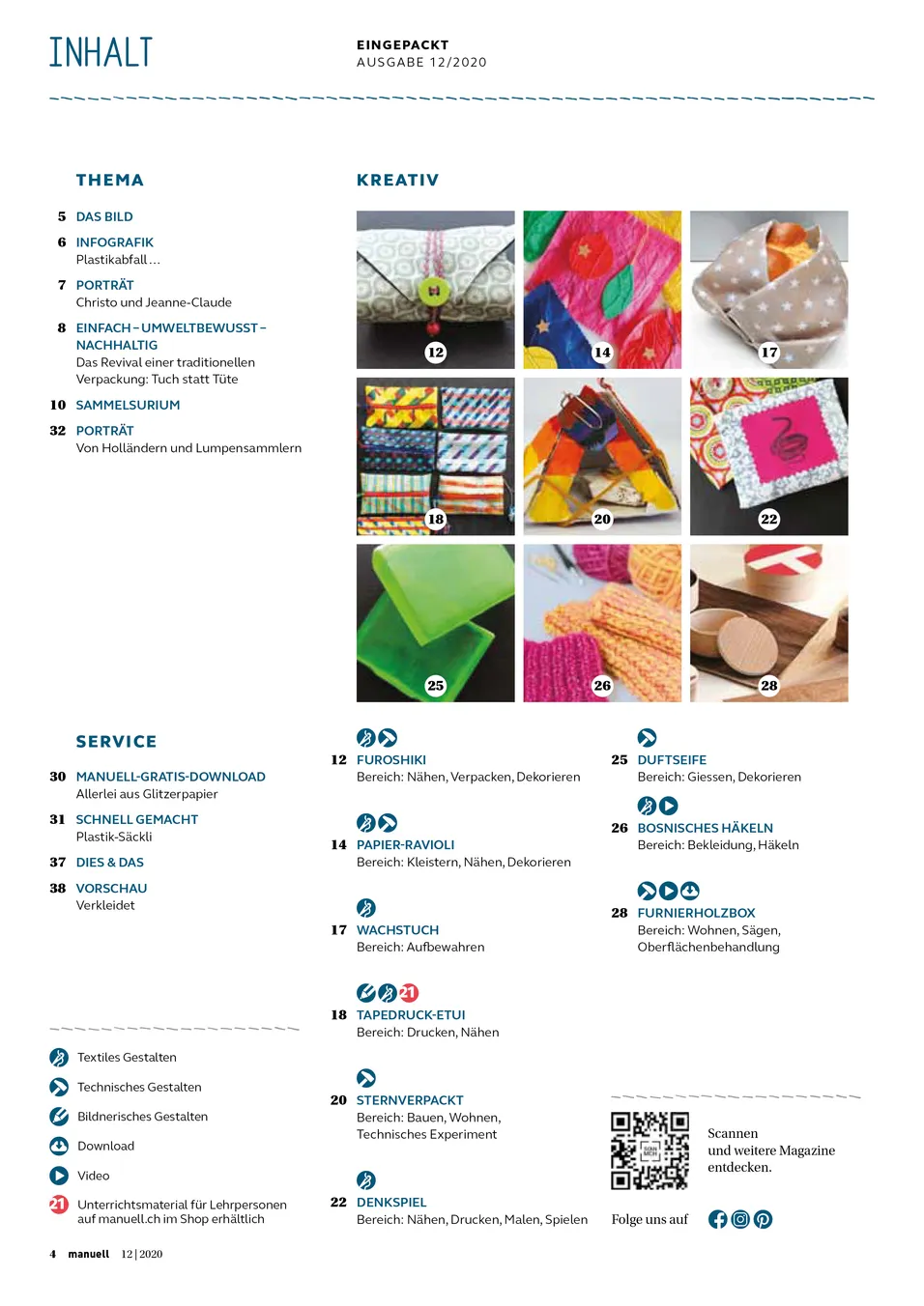 In dieser Ausgabe liegt unser Augenmerk auf schönen und nachhaltigen Verpackungen. Den Inhalt zum Einpacken liefern wir teilweise gleich mit dazu. So erkunden wir ferne Verpackungskünste aus Japan, verpacken Sternenwünsche an unsere Liebsten und lassen uns von gefüllten Papier-Ravioli überraschen. Wir zeigen, wie man warm eingepackt durch den Winter kommt und welche individuellen Gestaltungsmöglichkeiten uns eine simple Drucktechnik ermöglicht. Dies und vieles mehr liegt im aktuellen Magazin schön verpackt für dich bereit. Viel Spass beim Auspacken!