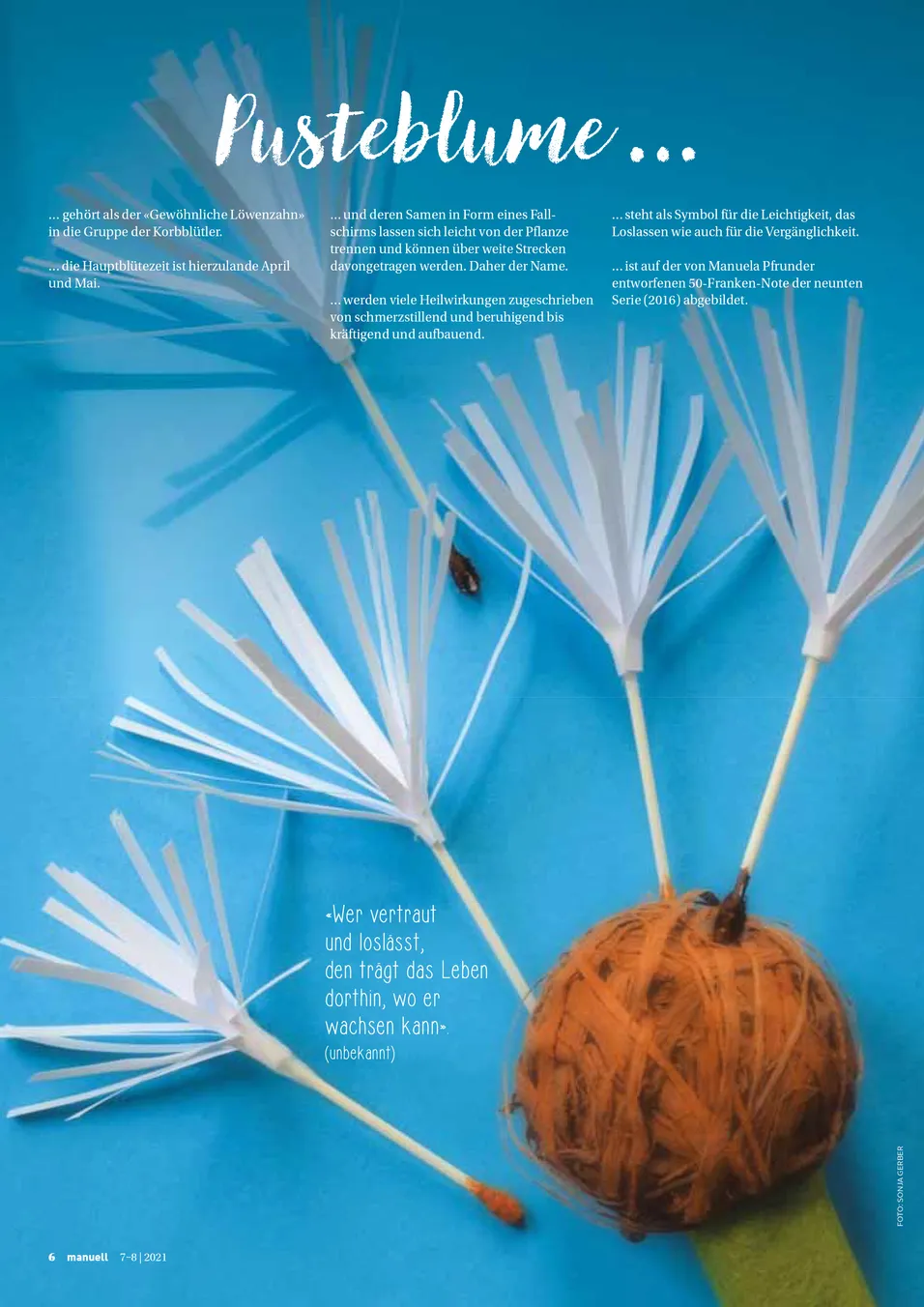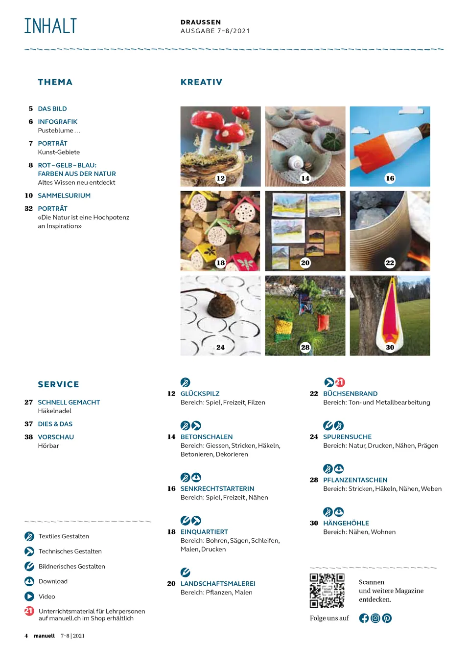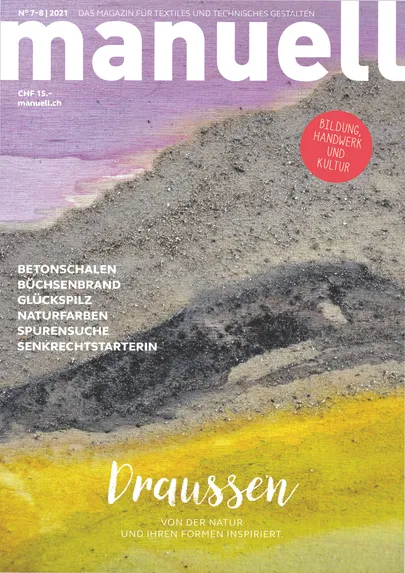 In dieser Ausgabe haben wir das Schulzimmer nach «Draussen» verlegt. Von Naturmaterialien inspiriert begeben wir uns auf Spurensuche, bemalen und bedrucken Stoffe, stellen Farben aus Pflanzen her, kombinieren Beton mit Strickware, schnitzen Häkelnadeln, filzen unvergängliche Glückspilze und mit dem Büchsenbrand ermöglichen wir uns endlich einen eigenen kleinen Brennofen. Für Abkühlung an heissen Tagen sorgt zumindest gedanklich - so ganz nach dem Motto ‘Vom Winde verweht’ - unsere Senkrechtstarterin. Ein Windsack in Form einer Rakete.