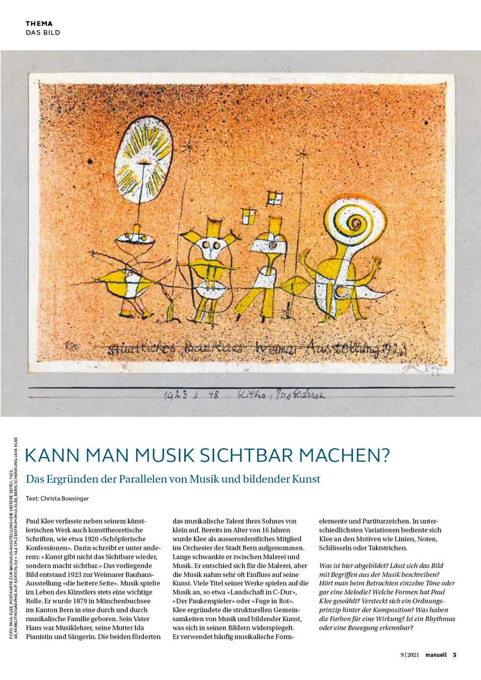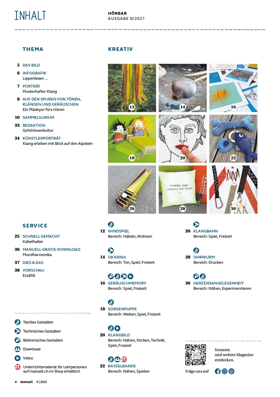 In dieser Ausgabe konzentrieren wir uns darauf Klänge unterschiedlicher Art zu erzeugen, sie bewusst wahrzunehmen und sie gestalterisch sichtbar zu machen. Wir hören bewusst auf unseren Herzschlag und visualisieren Herzensangelegenheiten. Aus dem Werkstoff Ton entsteht eine wohlklingende Okarina. Mit der Rasselbande halten wir Zwei- oder Vierbeiner spielerisch auf Trab und unser Klangbild überbringt hörbare Gruss-Botschaften. Ohrwürmer begleiten uns in den Schlaf und das leise Windspiel verteilt gemäss «Feng Shui» die Raumenergie besser.