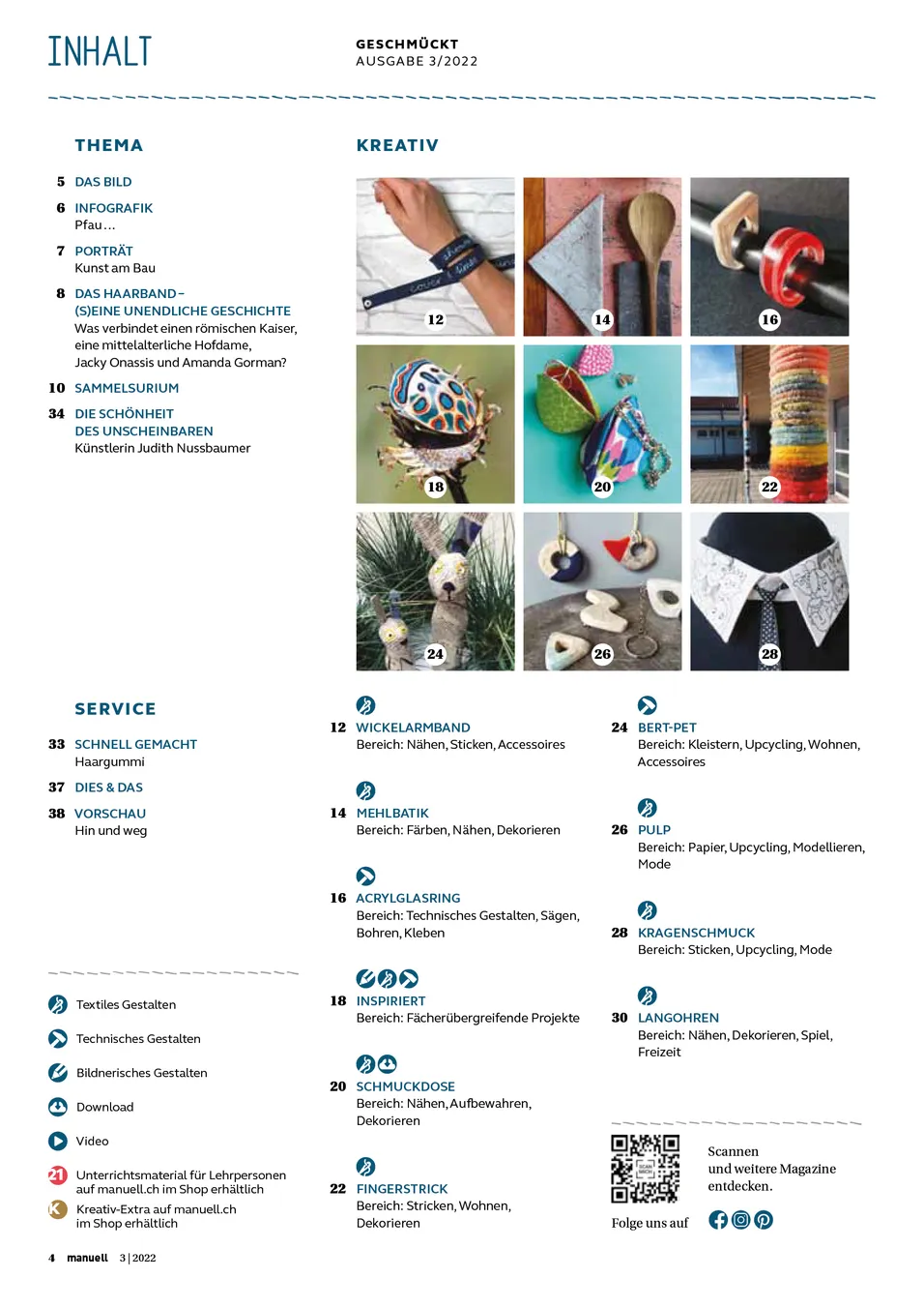 Eine Streicheleinheit für die Sinne oder gar eine Überlebenstaktik? Inspiriert von der Tierwelt und vom Gedanken der Nachhaltigkeit sind in dieser Ausgabe unterschiedliche schmuckvolle Objekte entstanden. Vom Körperschmuck aus Papier und Kunststoff über Tischwäsche, raffinierte kleine Dosen bis hin zur Schulhausdekoration ist für jeden Geschmack etwas dabei. Lasst euch verzaubern mit unseren Ideen.