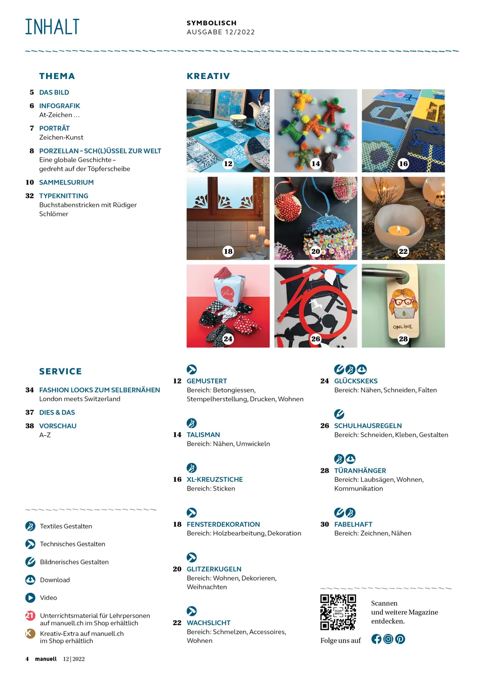 Symbole aus der ganzen Welt prägen unseren Alltag und ermöglichen uns in der Kreativwelt unzählige Gestaltungsmöglichkeiten. In dieser Ausgabe haben wir Muster und Ornamente zu Dekorationszwecken eingesetzt. Schulhausregeln werden zu Piktogrammen und unsere Türanhänger aus Holz vermitteln klare Botschaften. Wir streifen die Welt der Fabeltiere, wickeln kleine Talismane, nähen Glückskekse, sticken Riesenpixel und mit einem stimmungsvollen Wachslicht runden wir diese Ausgabe und somit dieses Jahr ab.