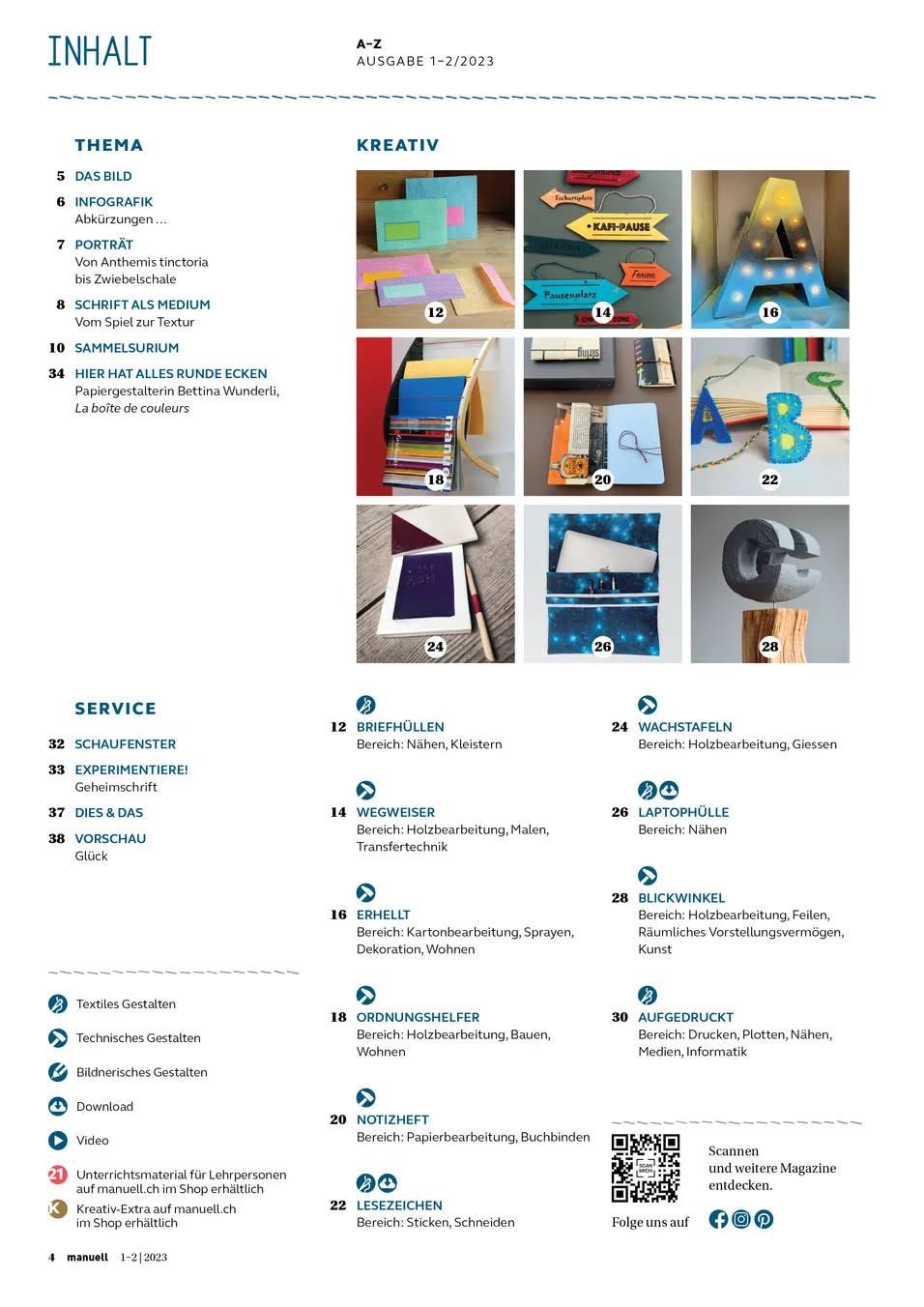 Wir beschäftigen uns in diesem Magazin mit allerlei Buchstaben. Ob aus Filz genäht, aus Schaummasse geformt oder aus Karton gebaut: sie alle setzen Akzente mit dem gewissen Etwas. Ausserdem ritzen wir Wachstafeln, binden Notizhefte, nähen Brief und Laptophüllen und drucken personalisierte QRCodes auf einfache Turnbeutel. Und wenn ihr nicht weiterwisst, dann lasst euch leiten von unseren Wegweisern oder schafft Platz mit unserem Ordnungshelfer. Im neuen Jahr kann somit nichts mehr schiefgehen.