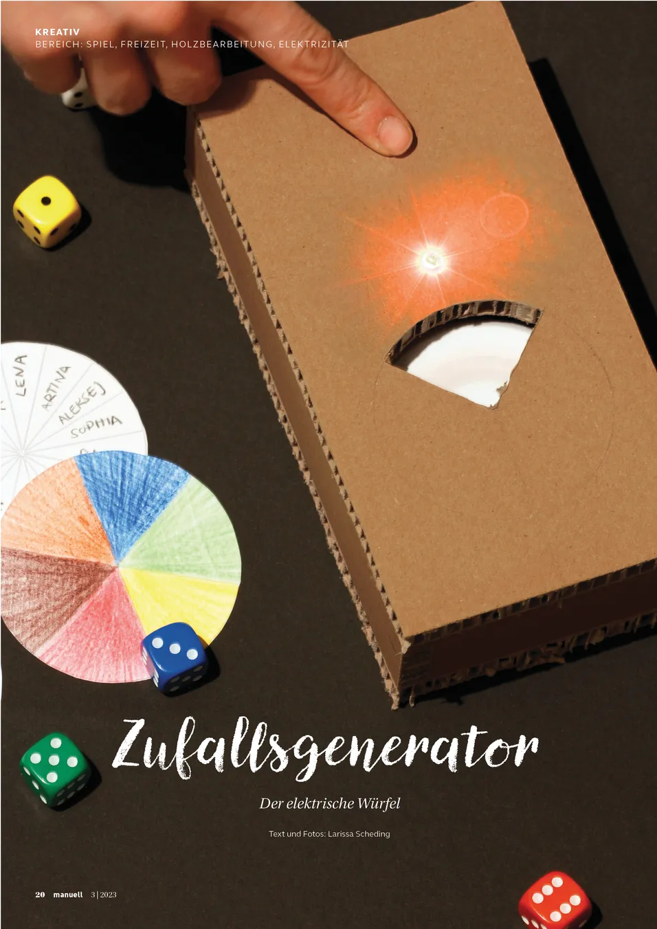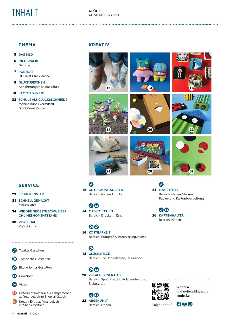 Mit unseren Händen das eigene Glück schmieden und Glücksmomente sammeln. Das ist es, was wir in dieser Ausgabe tun. Wir gestalten eigene «Happy Socks», nähen witzige Maskottchen und lassen uns nicht unterkriegen, wenn mal etwas nicht nach Wunsch läuft. Die farbenrohen Insektenhüllen für Coolpacks spenden Trost bei kleinen Blessuren und kleine Kostbarkeiten und Souvenirs erhalten einen würdigen Erinnerungsplatz. Und wenn ihr im Spiel oder anderswo mal nicht weiterwisst, dann überlasst das dem elektrischen Zufallsgenerator. Der nimmt euch die Entscheidung ab, ganz ohne zu schummeln. Guts Gelingen!