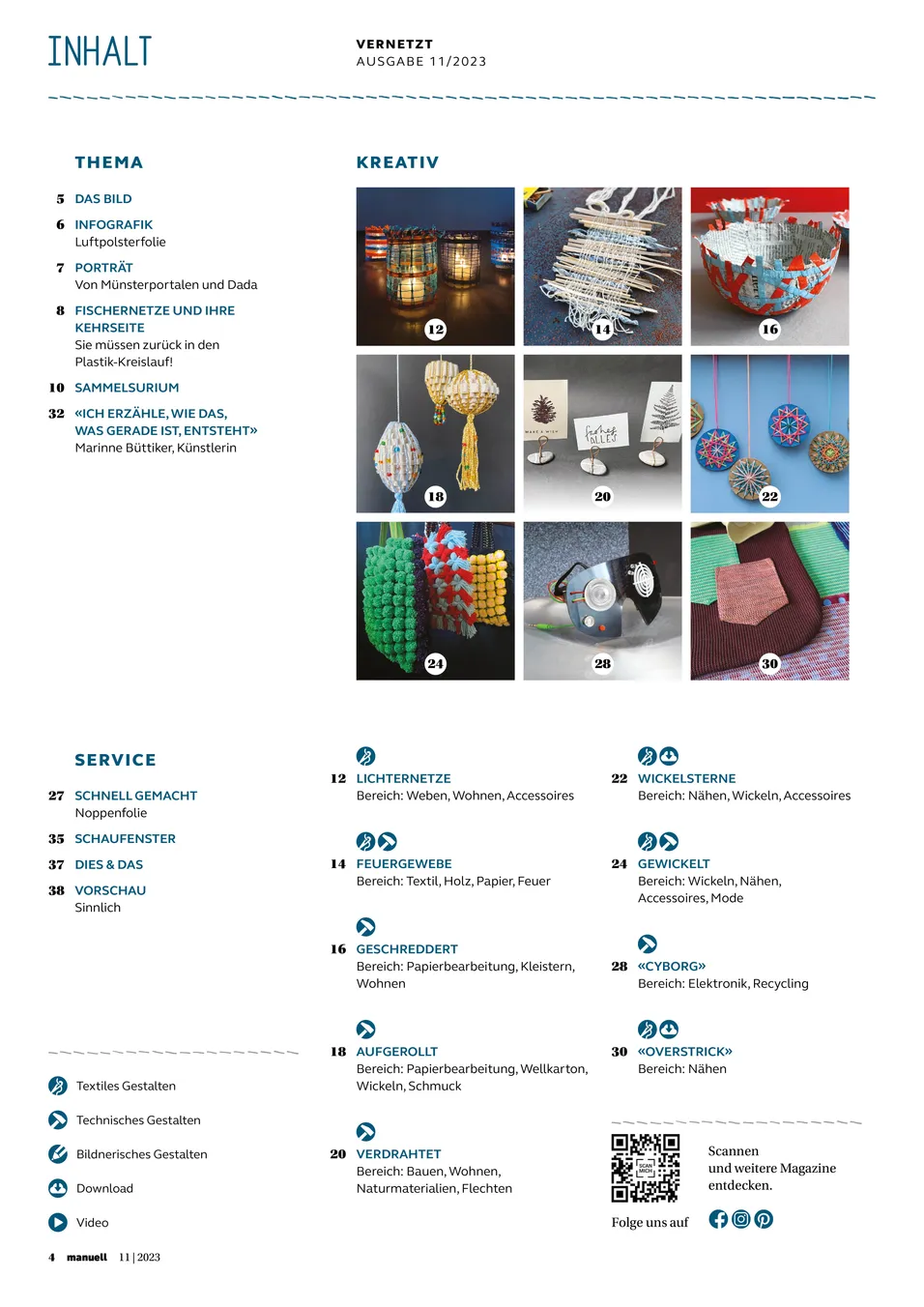 Unsere kreativen Vernetzungen haben es in sich! Spannende Materialien treffen auf bewährte Techniken und verbinden sich neu. Vernetzungen in der Kunst interessieren uns genau so sehr, wie das Zusammenspiel zwischen Mensch und Maschine. Ausserdem sind wir uns der Bedeutung der Interaktion zwischen Technologie und Kommunikation bewusst und möchten uns diese zu Nutze machen! Verbindet euch auf den sozialen Medien mit uns! Werdet Teil unserer «manuell-Community» und helft mit, manuell weiterzuentwickeln. Eure Stimmen und Meinungen zählen.
