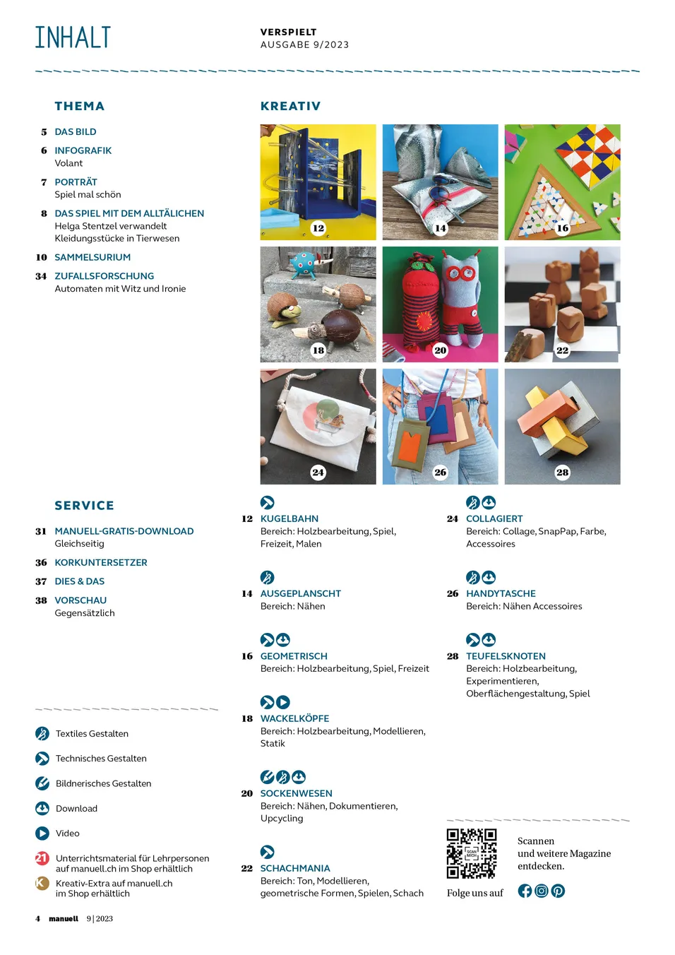 Lustvolles Lernen ist angesagt. In der Welt des Spiels gibt es keine Grenzen - nur unendliche Möglichkeiten, zu entdecken, zu lernen und zu wachsen. In dieser Ausgabe kombinieren wir verschiedene Möglichkeiten, Materialien und Techniken und erfinden Spiele, Objekte und Figuren. Taucht mit uns ein in die verspielte Welt von manuell und lasst euch von unseren Ideen verführen. Denn wie sagt man so schön: Wer genug spielt, trägt Schätze mit sich herum, aus denen man ein Leben lang schöpfen kann.