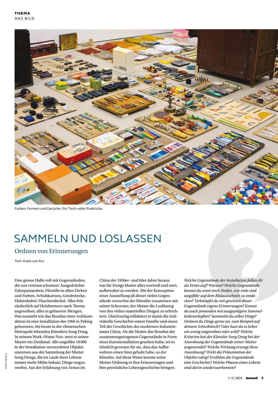 Ordnung anstelle von Vorsätzen, aber auf kreative Art und Weise! Wir haben die passenden Ideen für euch bereit. Geordnet, bunt und alles andere als langweilig starten wir das neue Jahr mit unserer ersten Ausgabe. Von aufgeräumter Kunst bis hin zu aufgehängten, ausgeschnittenen, geschützten und neu zusammengesetzten Objekten, zeigen wir euch auf, dass Aufräumen durchaus kreativ und lustvoll sein kann. Viel Spass beim Entdecken.