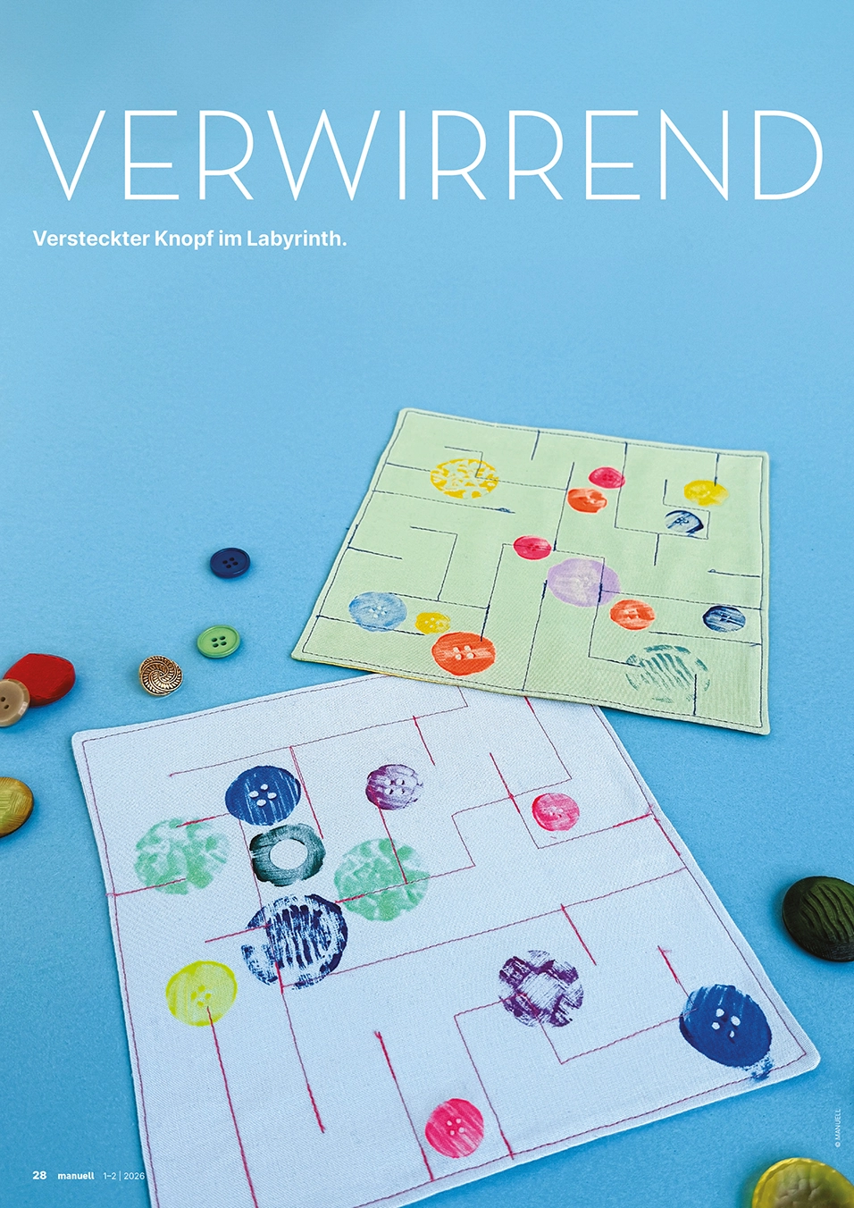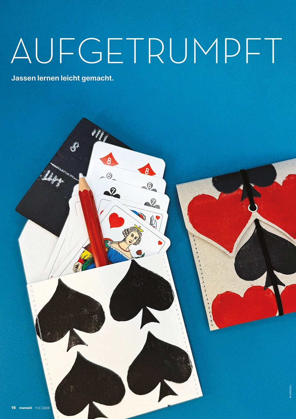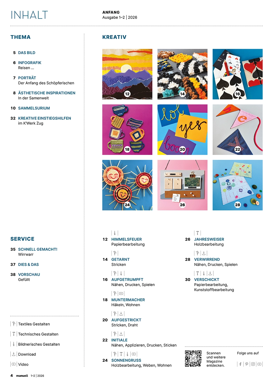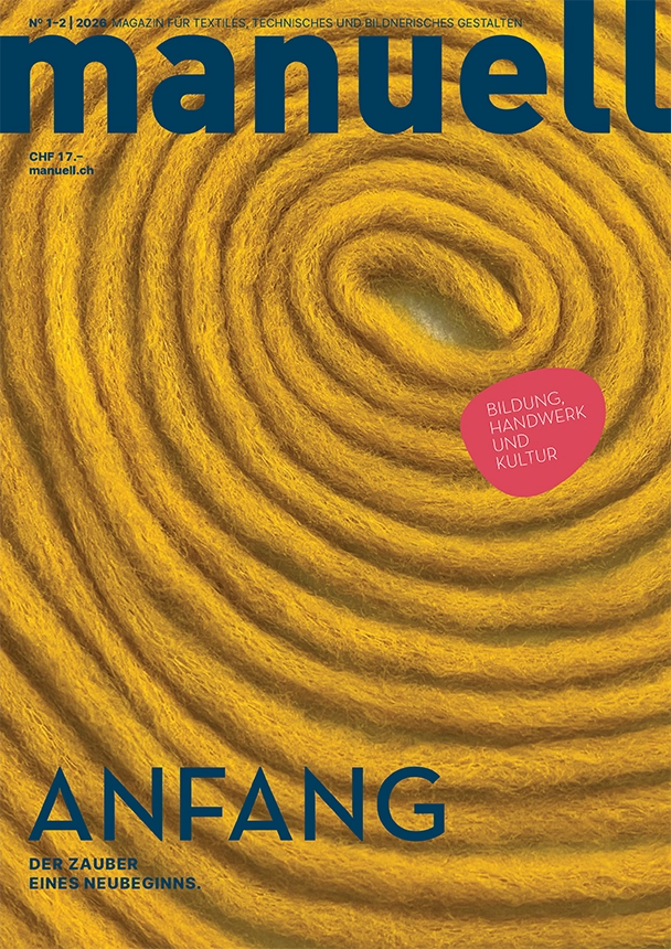 Den Jahresbeginn starten wir mit bunter Leichtigkeit. Strickanfänge verwandeln sich in fantasievolle Tiermuster oder werden zu schwungvollen Schriftzügen gebogen. Bunt genähte Wimpel bringen zum Schulstart frischen Wind ins Klassenzimmer, umwobene aus Holz gefertigte Sonnen strahlen um die Wette und ein Wandkalender aus Holz sorgt schon zu Jahresbeginn für Überblick und Struktur. Ein bedrucktes Starter-Kit mit Jass-Utensilien macht jede Anfängerin und jeden Anfänger zum Spielprofi, während ein textiles Labyrinth zum Entdecken einlädt. Papier wird gerissen, gefaltet, geklebt und zu collagierten Landschaftsbildern oder zu kunstvollen Briefumschlägen verarbeitet. Ausserdem ergründen wir die Vielfalt von Samen, setzen uns mit der Herausforderung der Kernkompetenz «Kreativität» auseinander und geben Tipps, wie die «Angst vor dem leeren Blatt» überwunden werden kann. Das uns vieles mehr erwartet euch in der ersten Ausgabe.