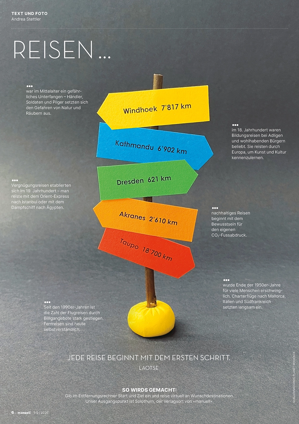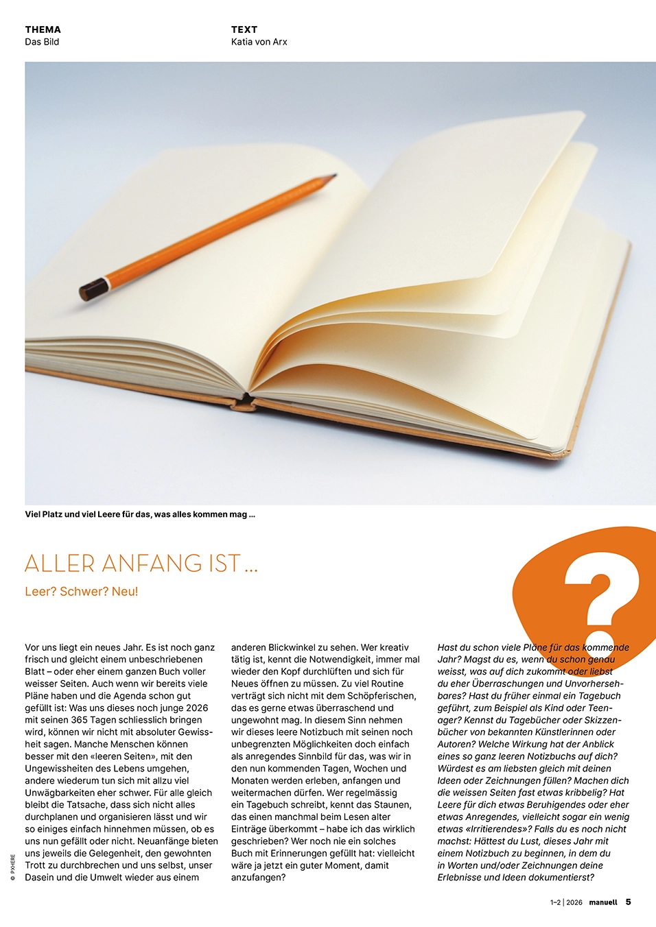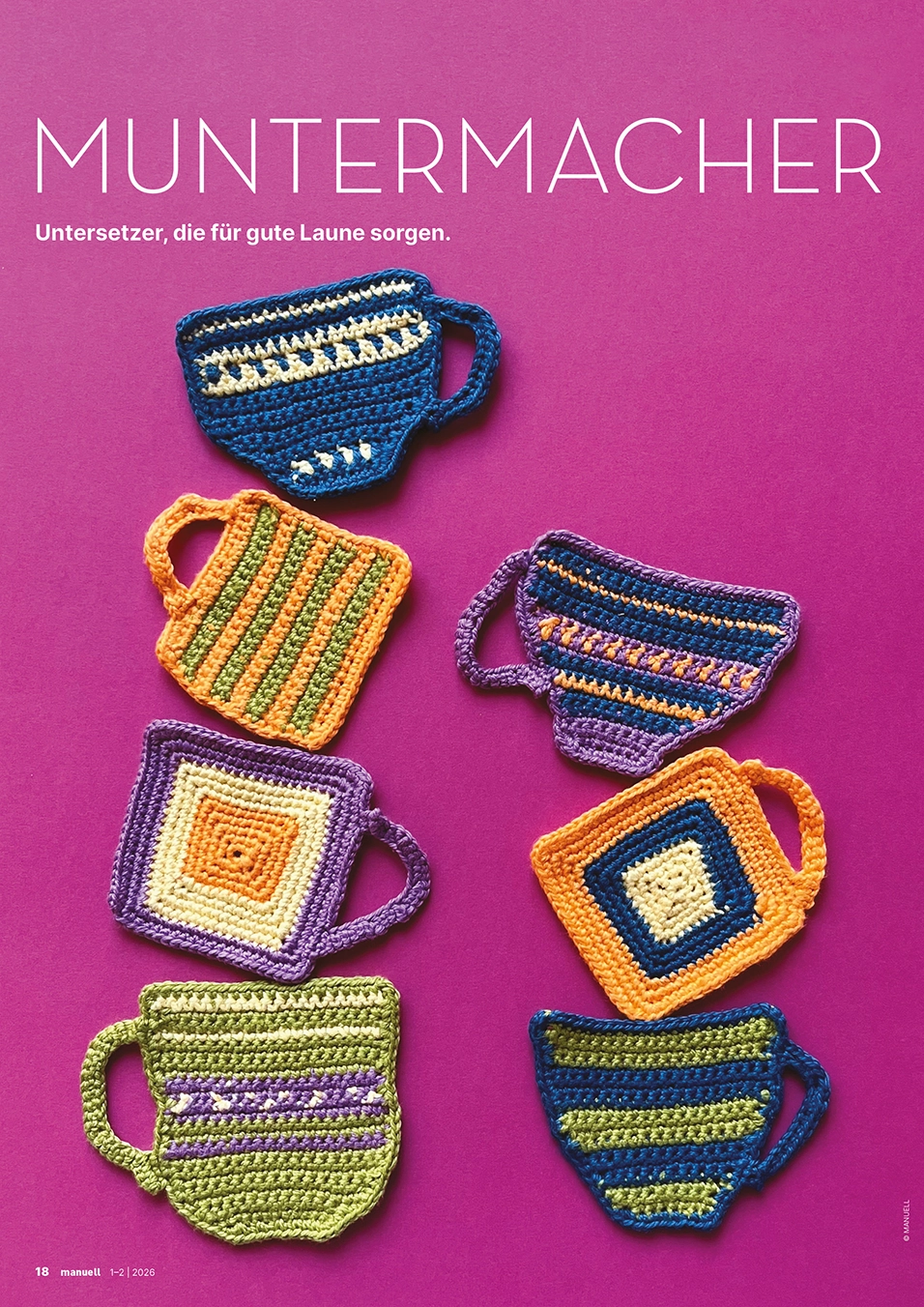Den Jahresbeginn starten wir mit bunter Leichtigkeit. Strickanfänge verwandeln sich in fantasievolle Tiermuster oder werden zu schwungvollen Schriftzügen gebogen. Bunt genähte Wimpel bringen zum Schulstart frischen Wind ins Klassenzimmer, umwobene aus Holz gefertigte Sonnen strahlen um die Wette und ein Wandkalender aus Holz sorgt schon zu Jahresbeginn für Überblick und Struktur. Ein bedrucktes Starter-Kit mit Jass-Utensilien macht jede Anfängerin und jeden Anfänger zum Spielprofi, während ein textiles Labyrinth zum Entdecken einlädt. Papier wird gerissen, gefaltet, geklebt und zu collagierten Landschaftsbildern oder zu kunstvollen Briefumschlägen verarbeitet. Ausserdem ergründen wir die Vielfalt von Samen, setzen uns mit der Herausforderung der Kernkompetenz «Kreativität» auseinander und geben Tipps, wie die «Angst vor dem leeren Blatt» überwunden werden kann. Das uns vieles mehr erwartet euch in der ersten Ausgabe.