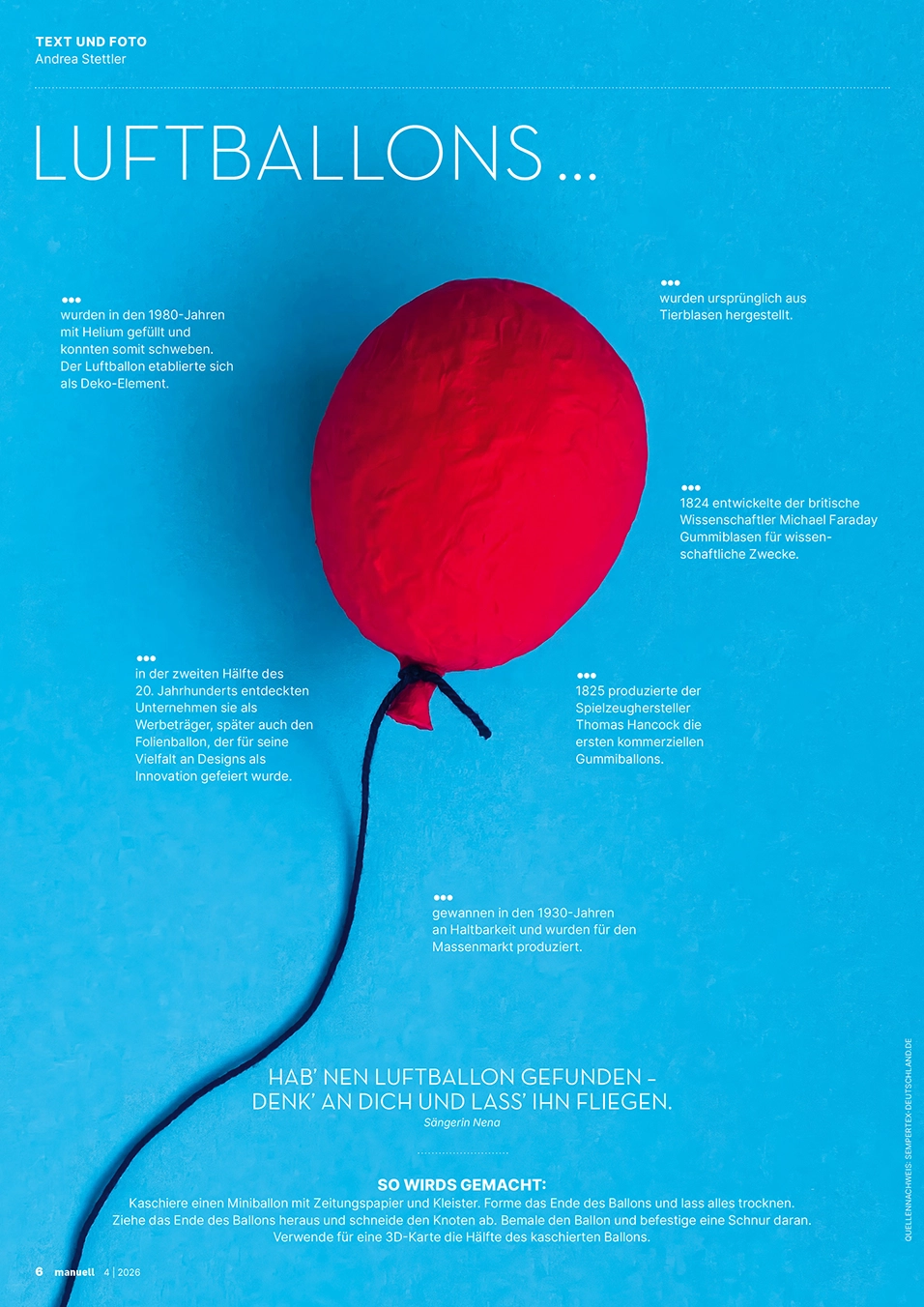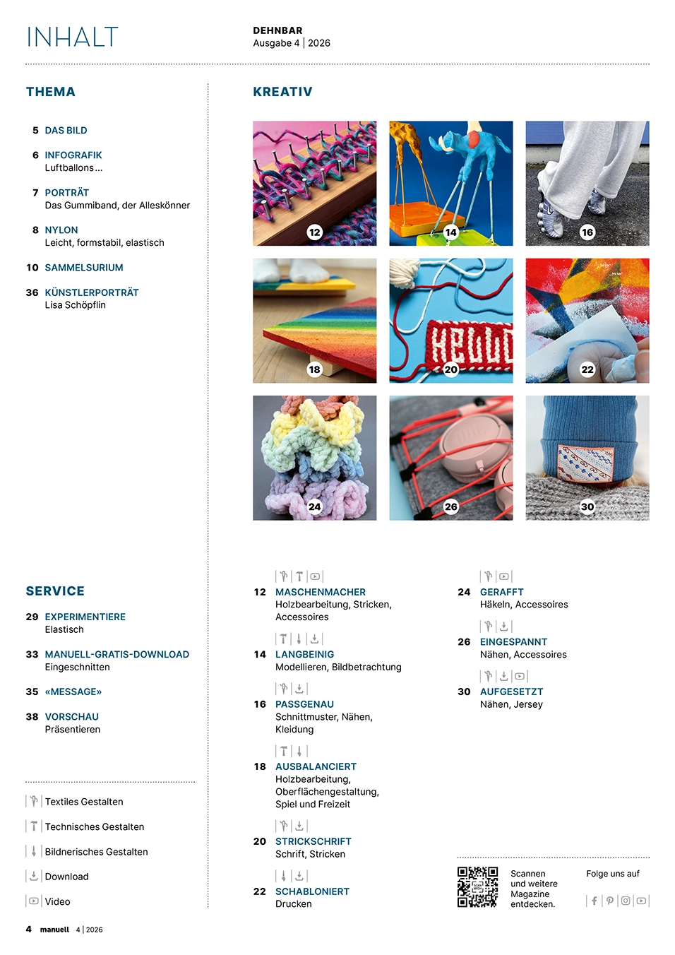 Wir bleiben flexibel– auch im kreativen Prozess. Unsere neue Ausgabe steckt voller Spannkraft. Eine breite Auswahl an Materialien und Werkzeugen ermöglichen facettenreiche Zugänge zum Thema: Aus Jersey entstehen lässige Jogginghosen und Beanies, mit Chenillegarn werden bunte «Scrunchies» gehäkelt, Wörter erscheinen in gestrickter Schrift und elastische Gummikordeln setzen gestalterische Akzente. Aus Holz entsteht ein Balancebrett für flexible Muskeln sowie eine Strickhilfe, die den Einstieg ins Maschenbilden erleichtert. Lederpapier erhält durch musterhafte Einschnitte eine dehnbare Struktur, während Nylonstrümpfe als Kunst und Kultobjekte sowie als innovative Druckwerkzeuge überraschen. Aus Plastilin – inspiriert von Dalís Fantasiewelten – entstehen langbeinige Tierwesen. Ausserdem lassen wir Luftballons «fliegen» und widmen dem guten alten Gummiband eine Odyssee. Das und vieles mehr findet sich im aktuellen Magazin.