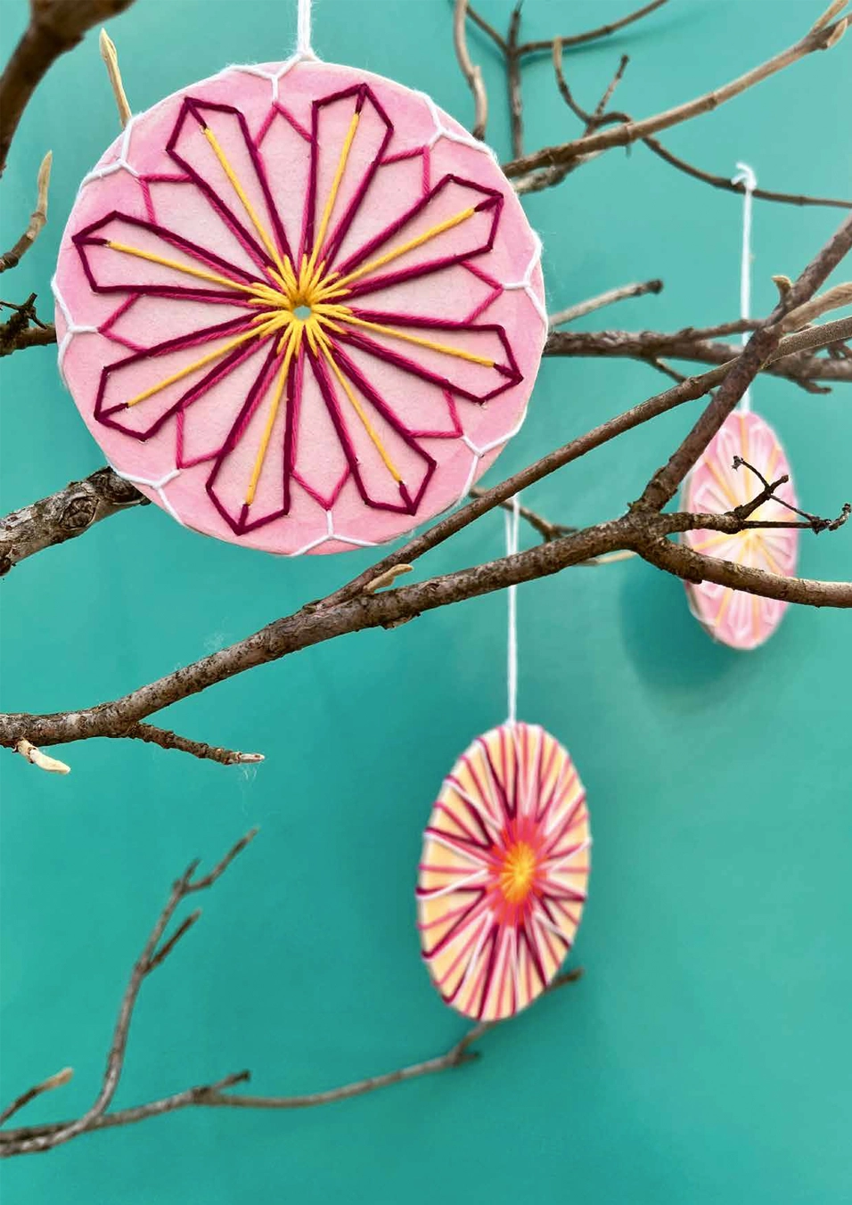 Einfach aber wirkungsvoll lassen sich Bierdeckel in Szene setzen. Heisse den Frühling willkommen! Zaubere blumige Anhänger und schmücke damit Äste, Fenster oder Türen. Die Stickereien auf dem kolorierten Hintergrund sind ein bunter Blickfang.