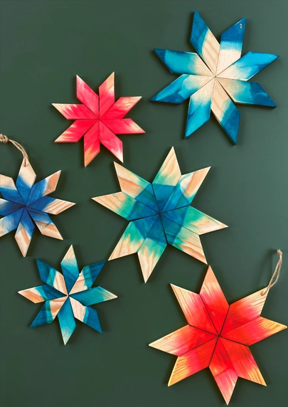 Bestimmt hast du von der «Dip Dye»- Methode schon beim Haarefärben gehört? Die Technik funktioniert mit Krepppapier auf Holz und hinterlässt ein wunderbar transparentes Farbenspiel. Experimentiere mit verschiedenen Farbnuancen und Eintauchzeiten und lass dich überraschen vom Ergebnis. Die gefertigten Sternanhänger sind ausserdem wunder schöne Blickfänger für die Weihnachtszeit.