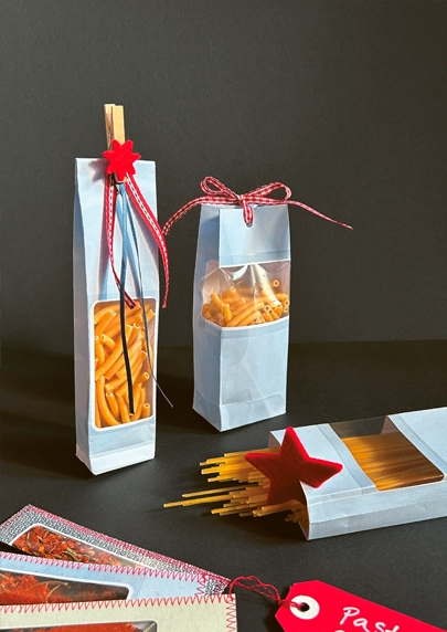 Diese Geschenkbeutel aus alten Briefumschlägen haben es in sich! Anstatt ins Altpapier zu wandern, werden sie zu innovativen Geschenkpackungen mit raffinierten Einblicken «umgestaltet». Spiele mit den Transparenzen und gestalte beispielsweise Portionenbeutel für Gewürzmischungen und Tüten für Pasta. Verziert mit hübschen Anhängern, wird die Freude beim Schenken und beschenkt werden garantiert gross sein.