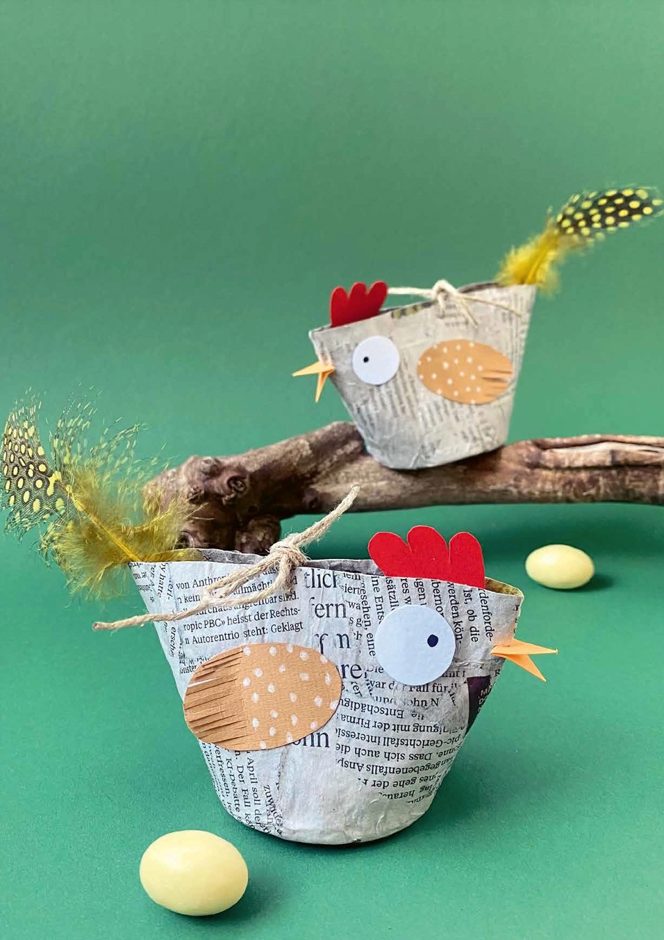 Fehlt dir noch eine witzige Tischdeko für Ostern? Kreiere mit der Kaschiertechnik diese lustigen Hühner und fülle sie mit leckeren Süssigkeiten. Die muntere Hühnerschar wird deine Gäste garantiert zum Schmunzeln bringen. Auch als kleines Mitbringsel eignen sich die Hühner prima.