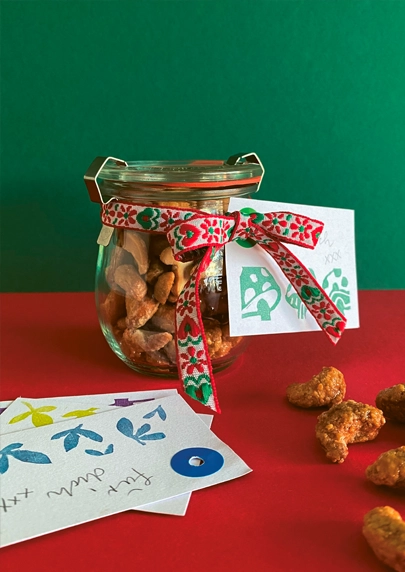 Gegensätze können gut schmecken. In diesem kleinen Projekt zauberst du feine Geschenke aus der Küche. Die knusprig gebackenen, süsssalzigen Cashewnüsse sind einfach herzustellen und gleichzeitig ein köstlicher Snack. Im Glas verpackt, verziert mit einem persönlich gestalteten Anhänger, kreierst du damit ein originelles Mitbringsel.
