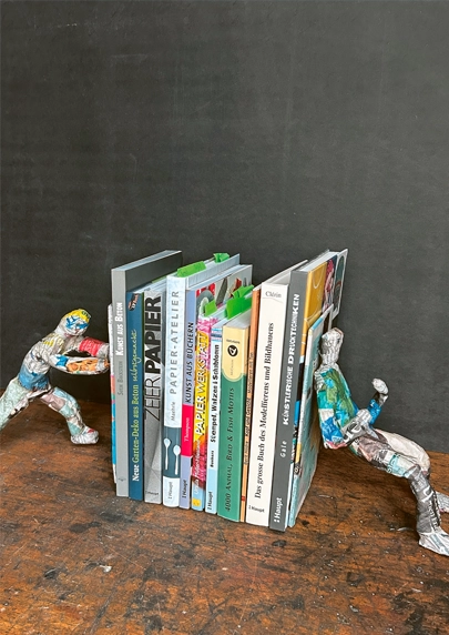 Schluss mit umgekippten Büchern! Diese kraftvollen Figuren aus Draht und Papiermaché stützen die Bücherreihe von beiden Seiten und bringen Ordnung ins Regal.