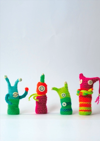 Diese aus einem gestrickten Rechteck bestehenden Wesen eignen sich prima als erste Strickarbeit. Die Augen sind aus fluoreszierender Modelliermasse geformt, strahlen bei Tageslicht farbig und bringen nachts Licht ins Dunkle. Überzeug dich selbst!