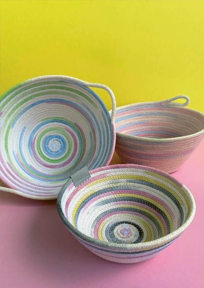 Egal, ob gross, klein, flach, bauchig, mit oder ohne Henkel. Alle Varianten dieser dekorativen Seilkörbe sind aus lückenhaft gefärbtem Seil gefertigt und zeichnen sich aus durch ein zufälliges und spannendes Farbenspiel. Probier es aus und lass dich begeistern.
