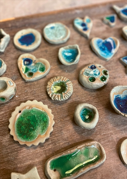 Aus Glasscherben Schmuck herstellen? Die Hitze macht es möglich. Wenn bei 1250 °C Glas und Ton verschmelzen, entstehen durch Risse und Farbverläufe faszinierende Strukturen sowie Musterungen. Zum Anhänger verarbeitet schmücken diese wunderbaren Unikate den Weihnachtsbaum oder hinterlassen als Halsschmuck getragen einen bleibenden Wow-Effekt.