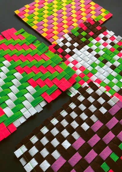 Suchst du ein «Update» zum klassischen Weben mit Papierstreifen? Bitte schön! Textilfilzstreifen lassen sich wunderbar verweben und zu farbenfrohen Untersetzern weiterverarbeiten.