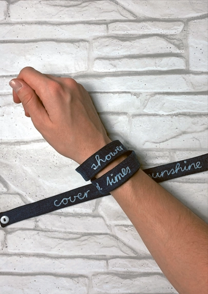 Hast auch du eine Textzeile aus einem Song, einem Buch oder eine Botschaft, die dir besonders gut gefällt? Bestimme deinen persönlichen Spruch und verewige ihn mit Freihandstickerei auf einem Armband aus Jeansresten.