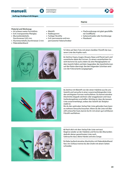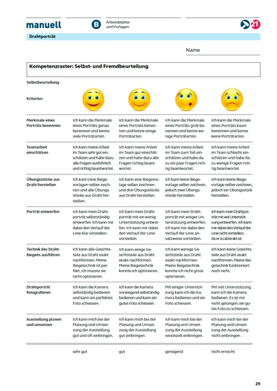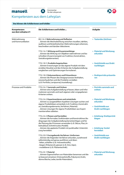 Das UM «Drahtporträt» eignet sich für den Zyklus 2. Es bietet auf 30 Seiten eine umfassende Planung für mehrere Unterrichtseinheiten und beinhaltet alle dazu notwendigen Lernziele, Checklisten (inklusive Materialchecklisten), Anleitungen, Bilder, Links, Video- und Literaturtipps sowie Arbeitsblätter und Beurteilungsformulare. Lehrpersonen profitieren von der hohen Qualität eines bereits erprobten Unterrichtskonzepts und sparen Zeit bei der Ideenfindung und Planung ihres abwechslungsreichen und kompetenzorientierten Unterrichts.